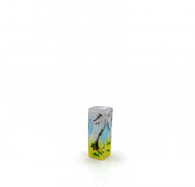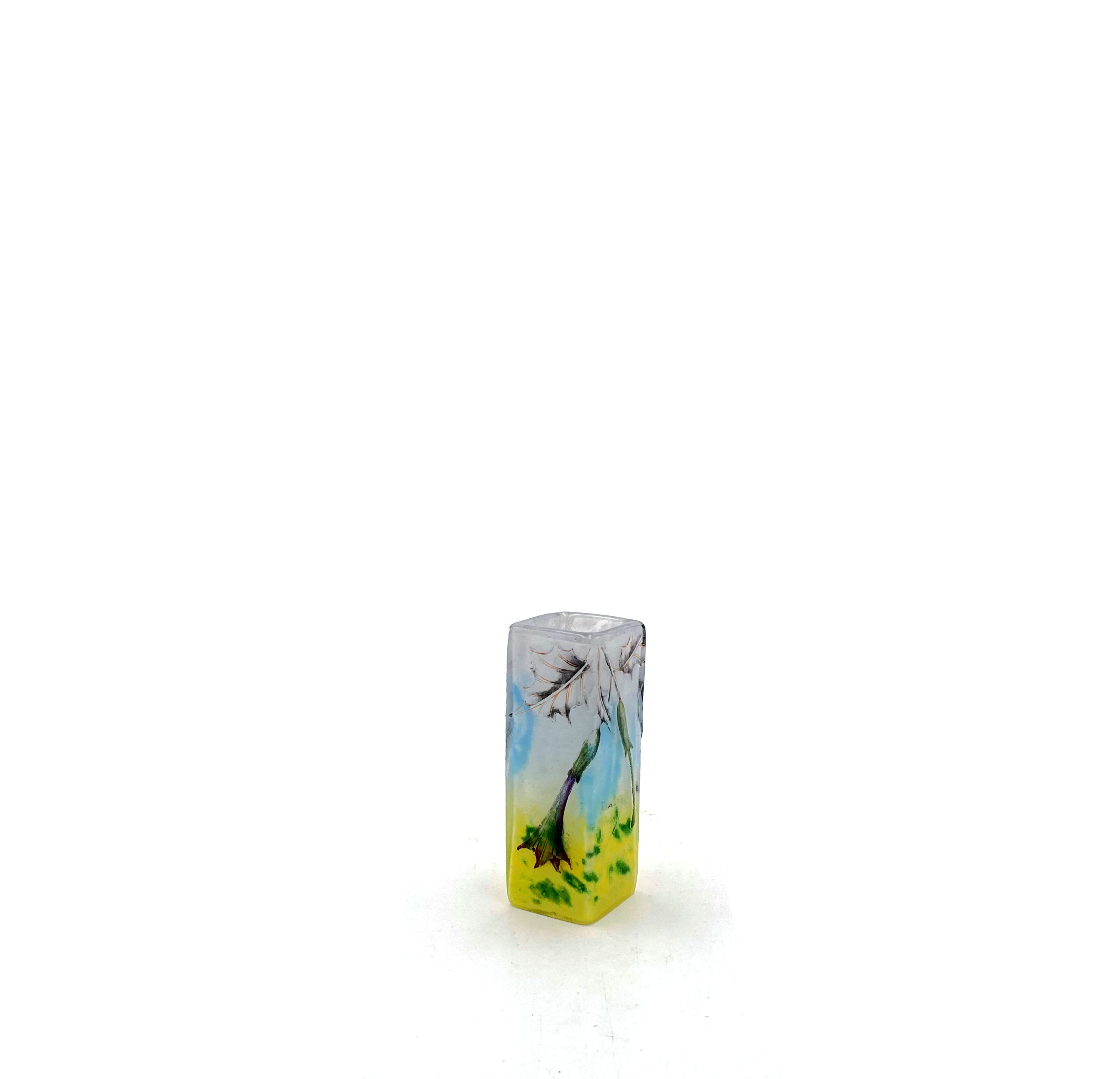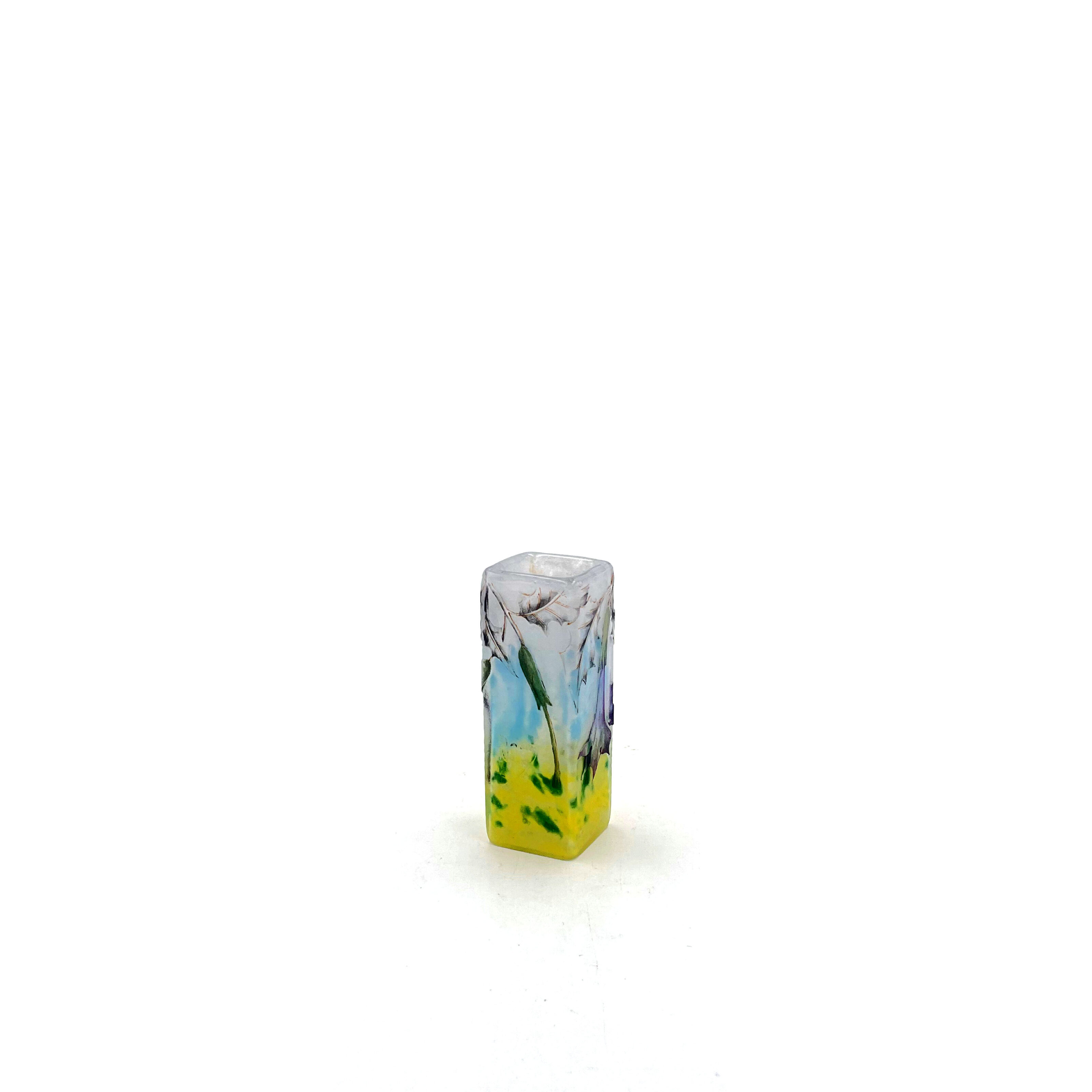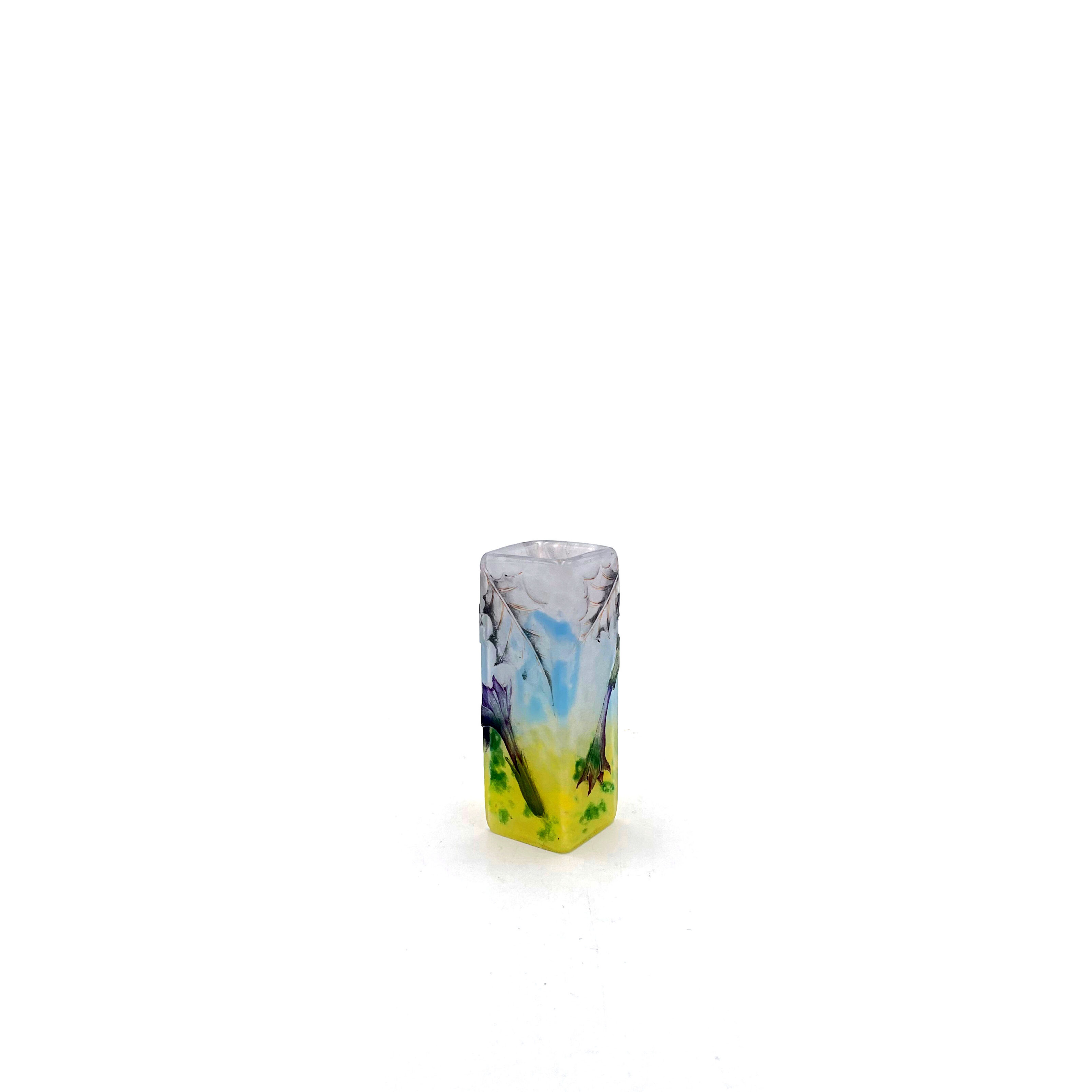 Cute Daum Nancy Vase, square form with Datura flowers over blue, green and yellow cameo colors, signed “Daum Nancy” on the side. Item #5484
