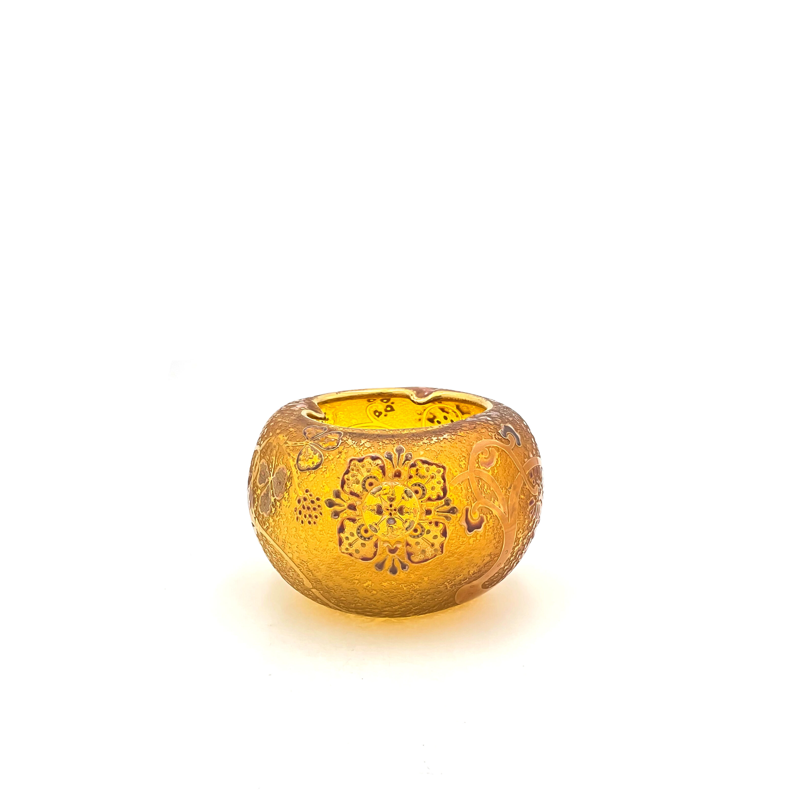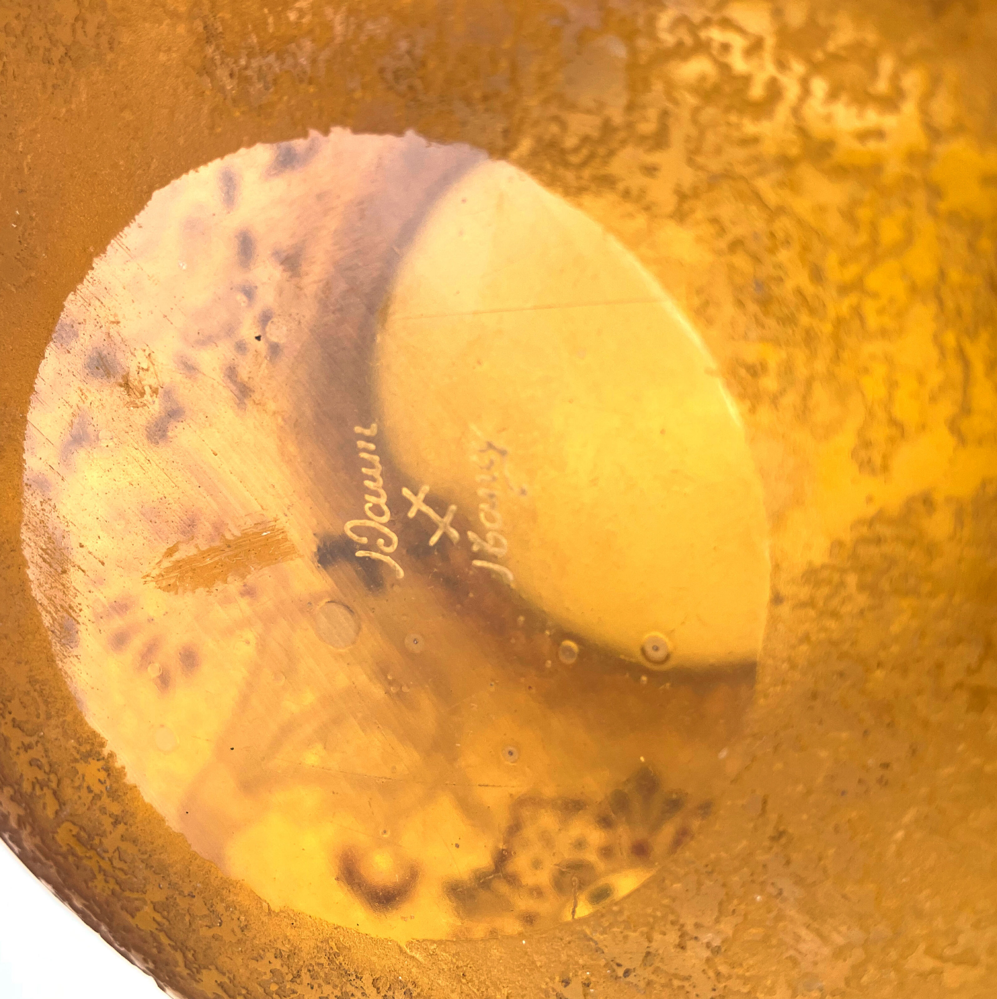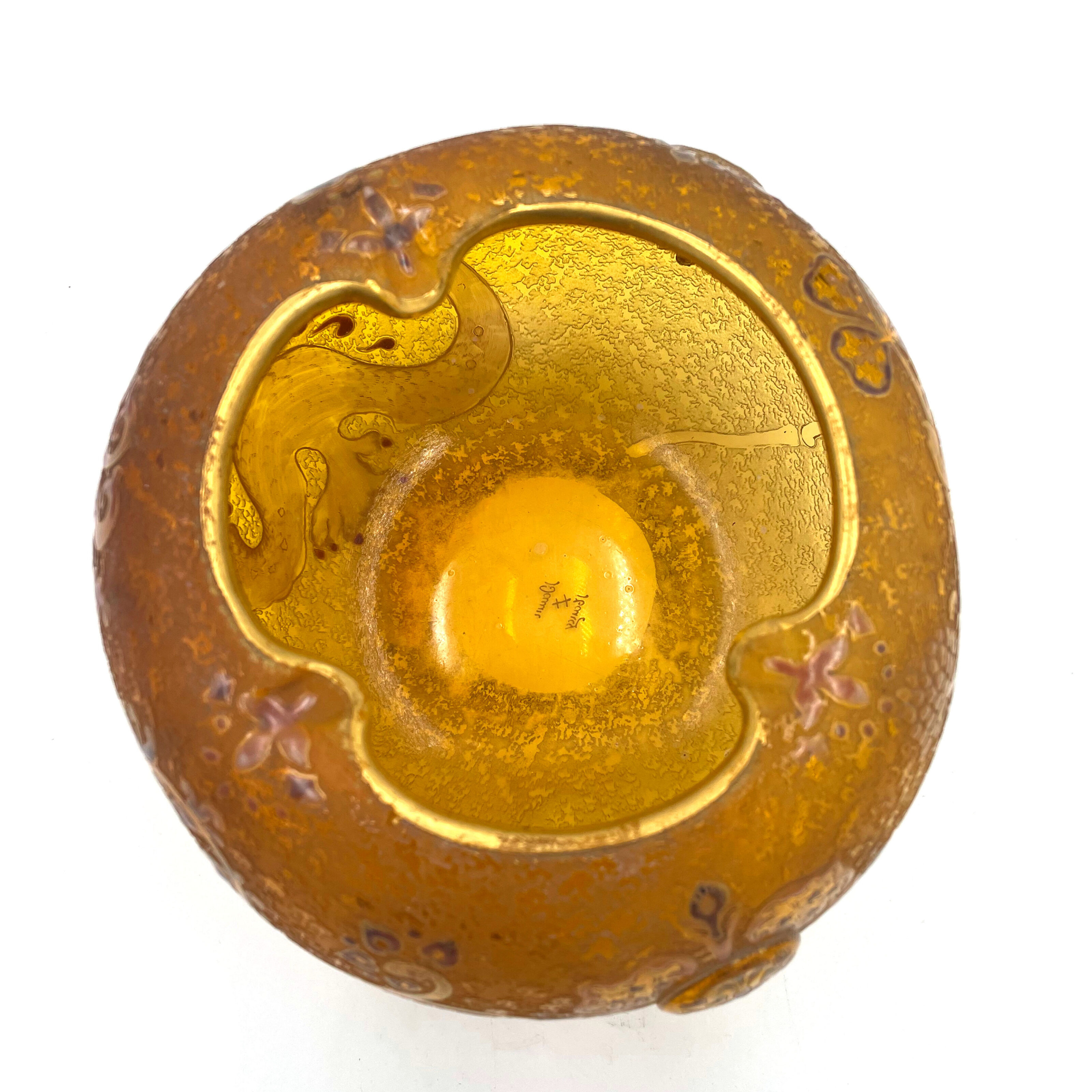 Rare Daum Nancy Bowl, large size early period crimped bowl with an enameled dragon and applied cabochons that are also enameled, signed “Daum Nancy” on the bottom. Item #5601