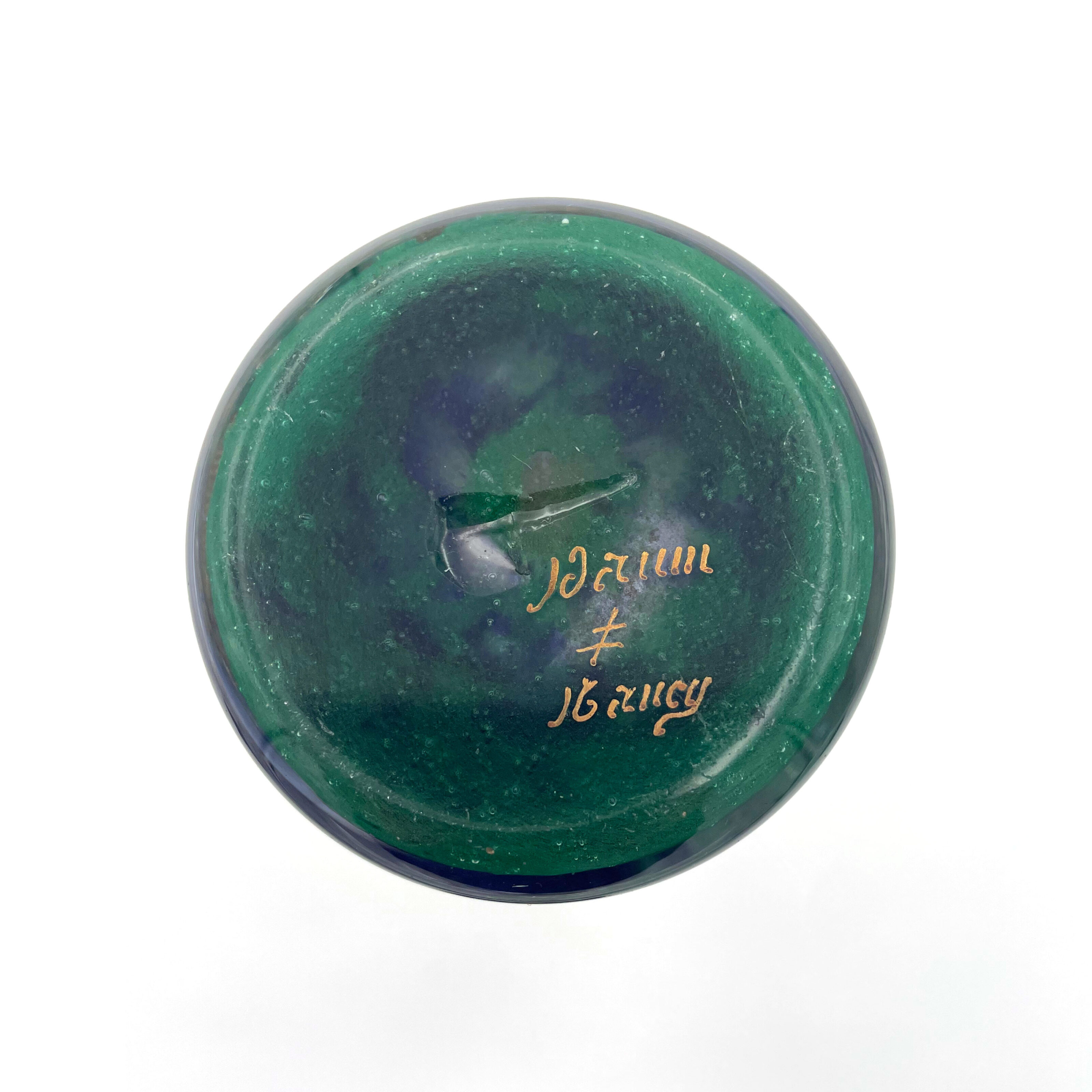 Colorful Daum Nancy Bellflower Vase, mottled blue, purple and green colored glass with enameled blue Bellflowers along with a gold gilding design around the bottom portion of the vase, crisp “Daum Nancy” signature on the bottom. Item #3986