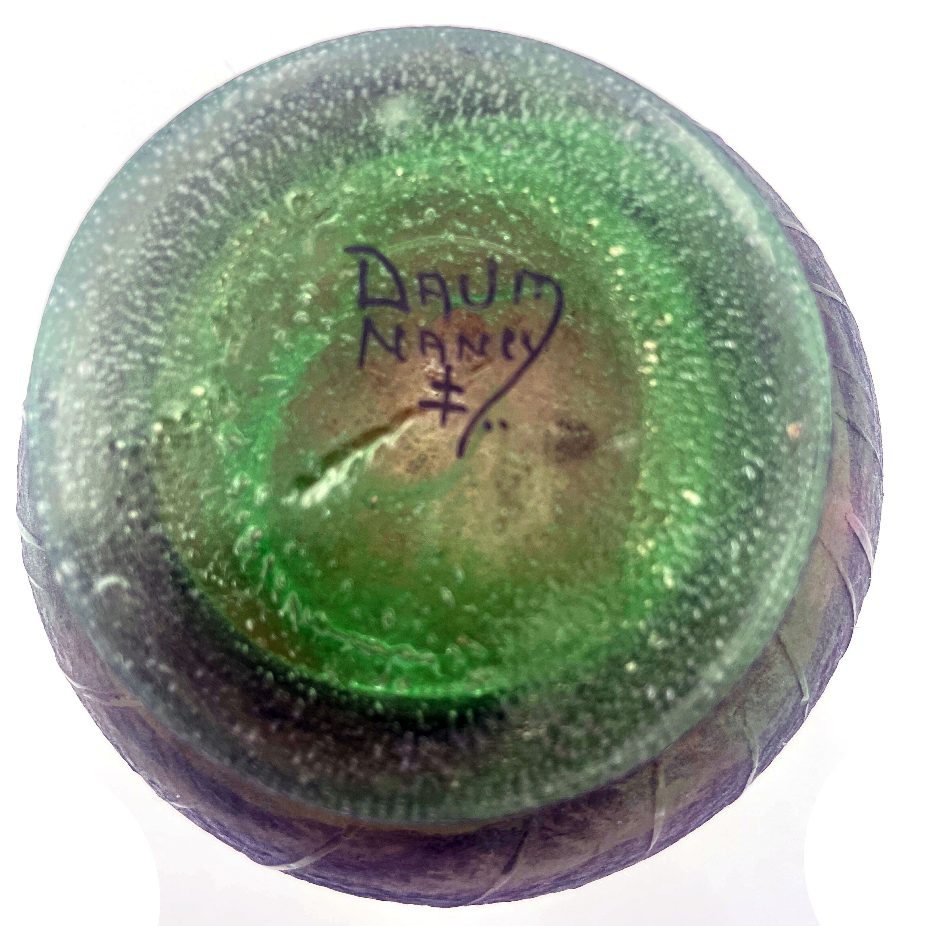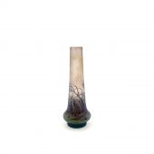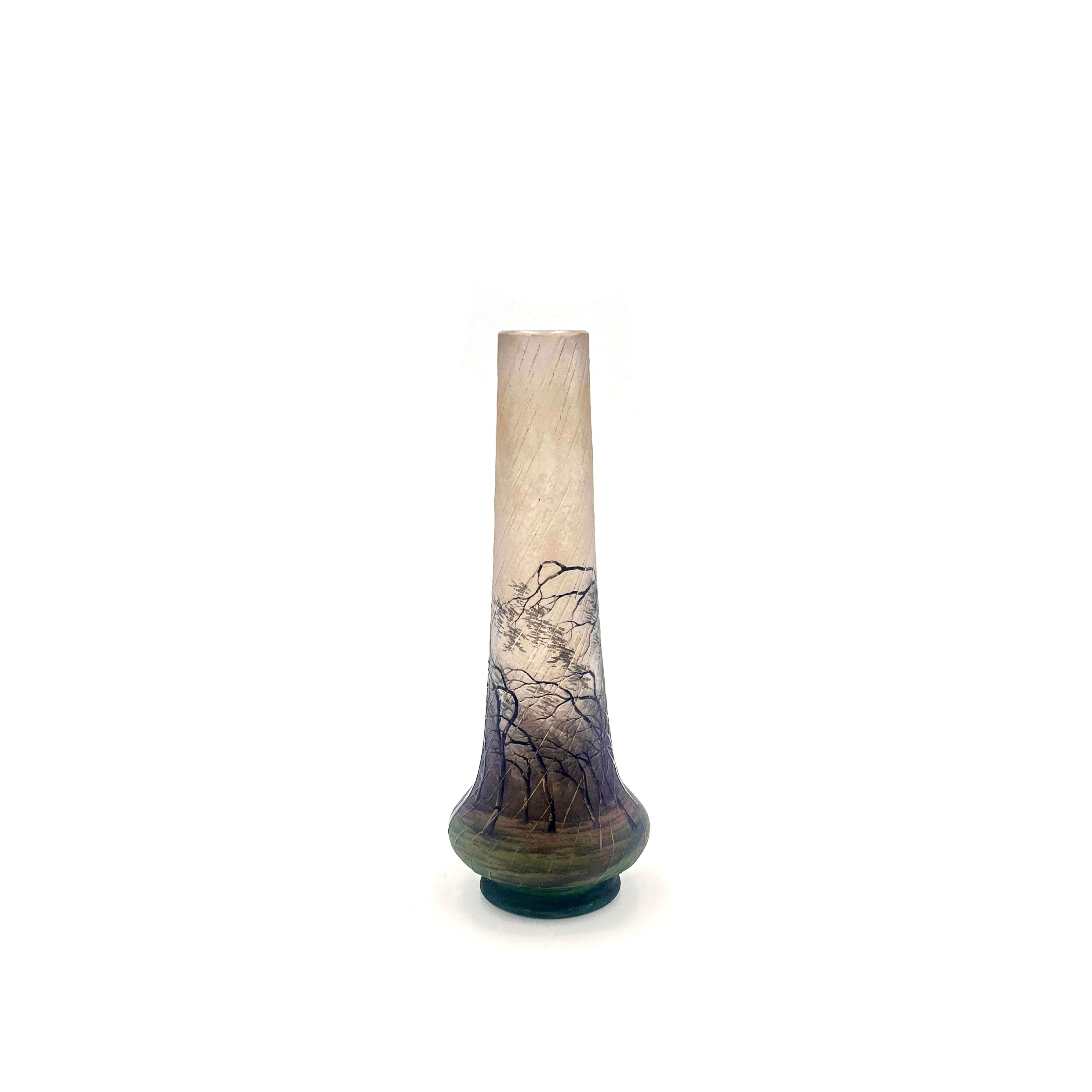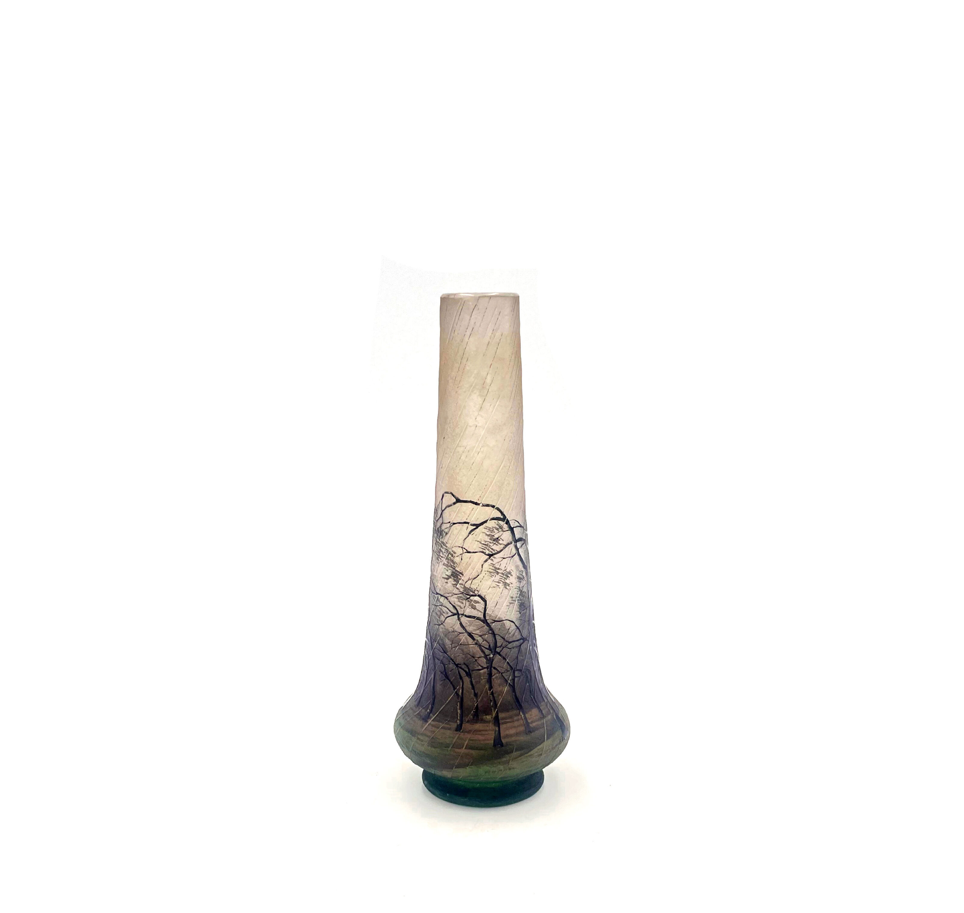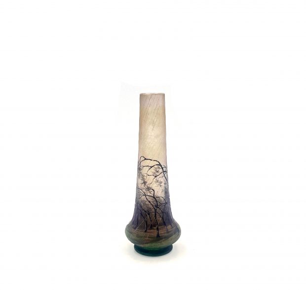 Popular Daum Nancy Rain Scene, decorated with barren forest scene of windblown trees in a driving rain storm set against a background of green shading to light pink to clear, signed on the bottom “Daum Nancy”, item #3922