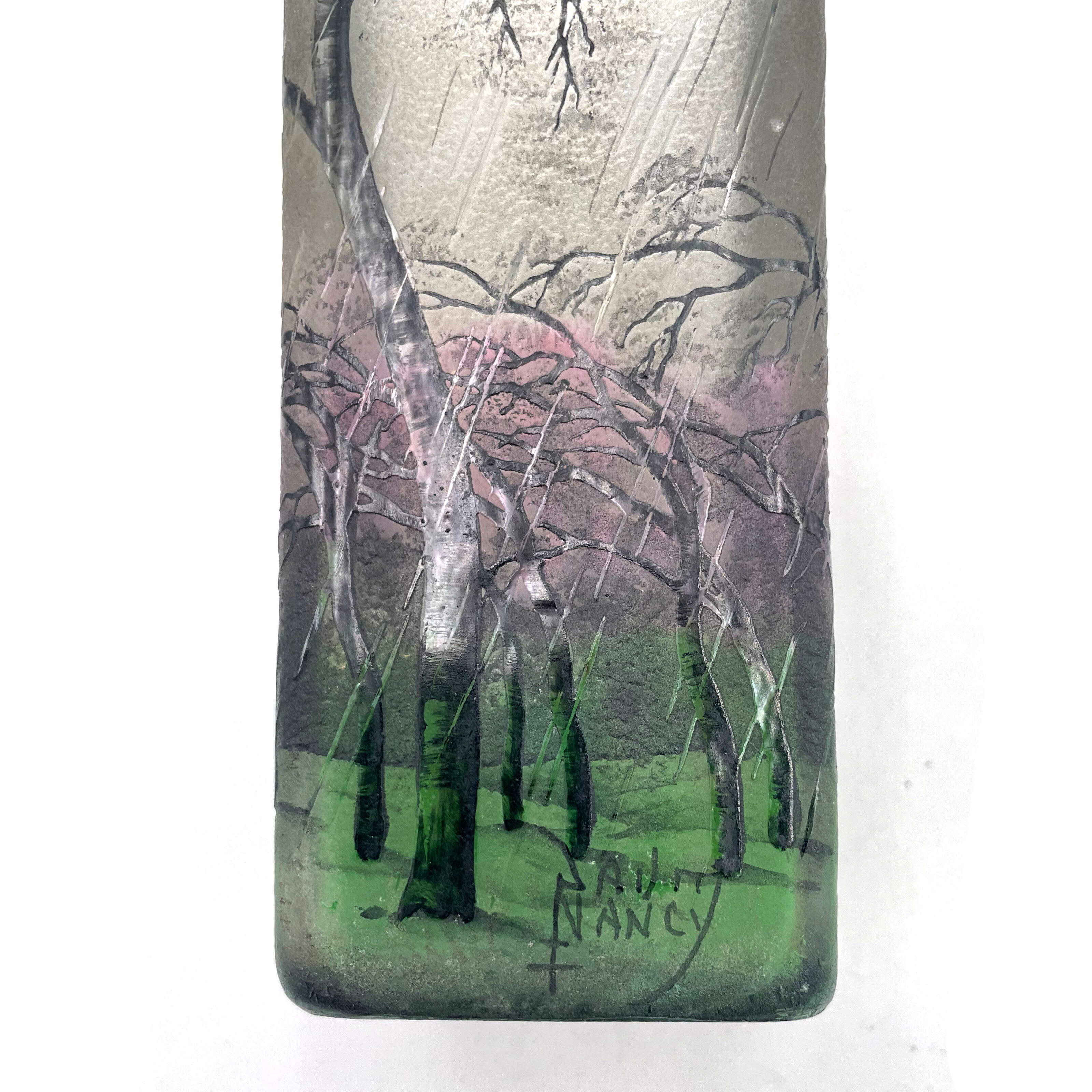 Rare Daum Nancy Rain Scene, square tumbler shape or sometimes called a toothbrush holder with leafless trees in a rain storm over green, clear and pink glass, signed “Daum Nancy” on the lower side, a very nice example. Item #5573