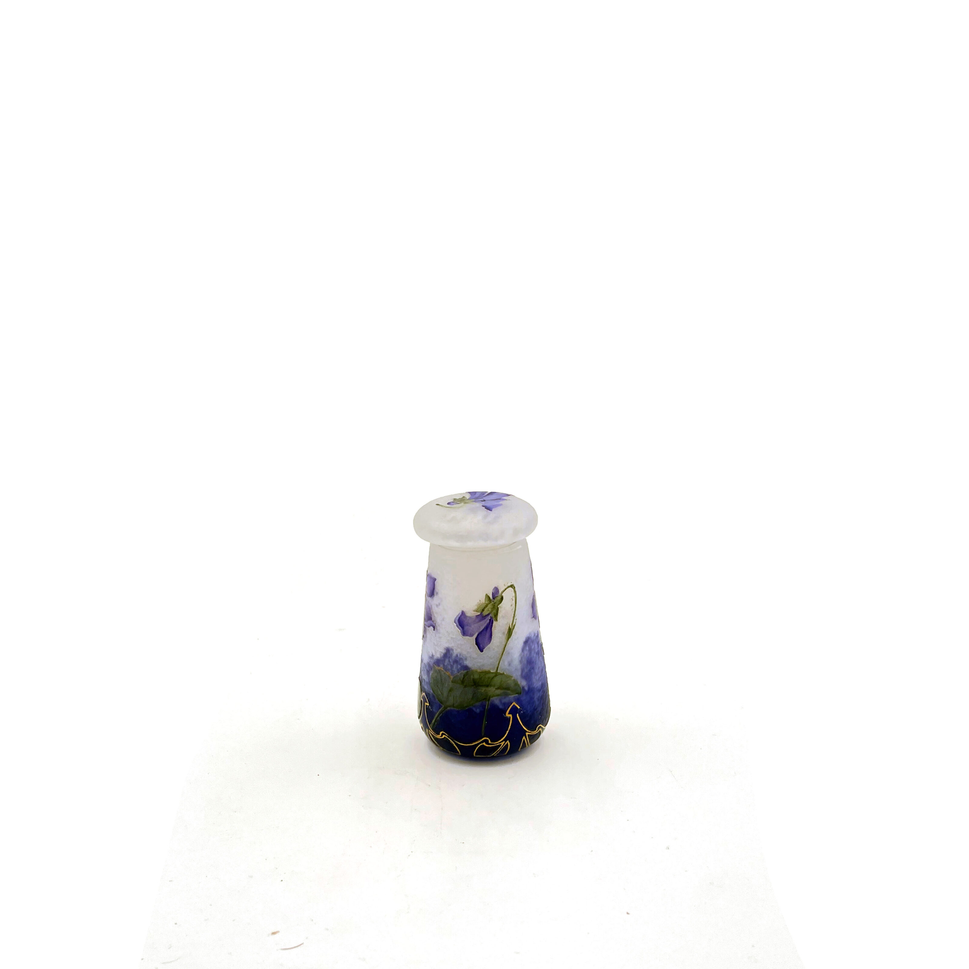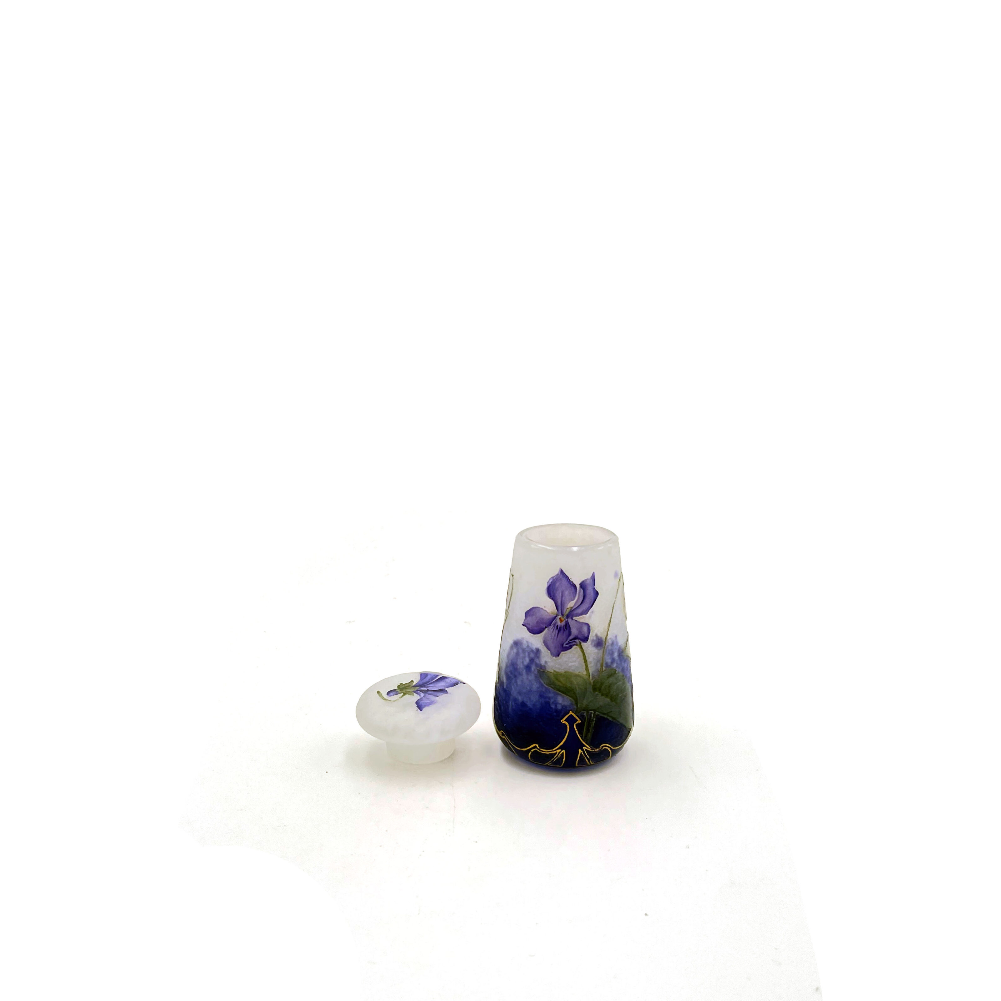 Rare Daum Nancy Violets, covered bottle form with matching top, violet decoration to the body and lid with gold gilding surrounding the bottom portion, signed “Daum Nancy” on the base.
