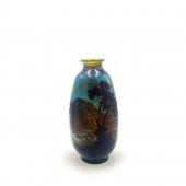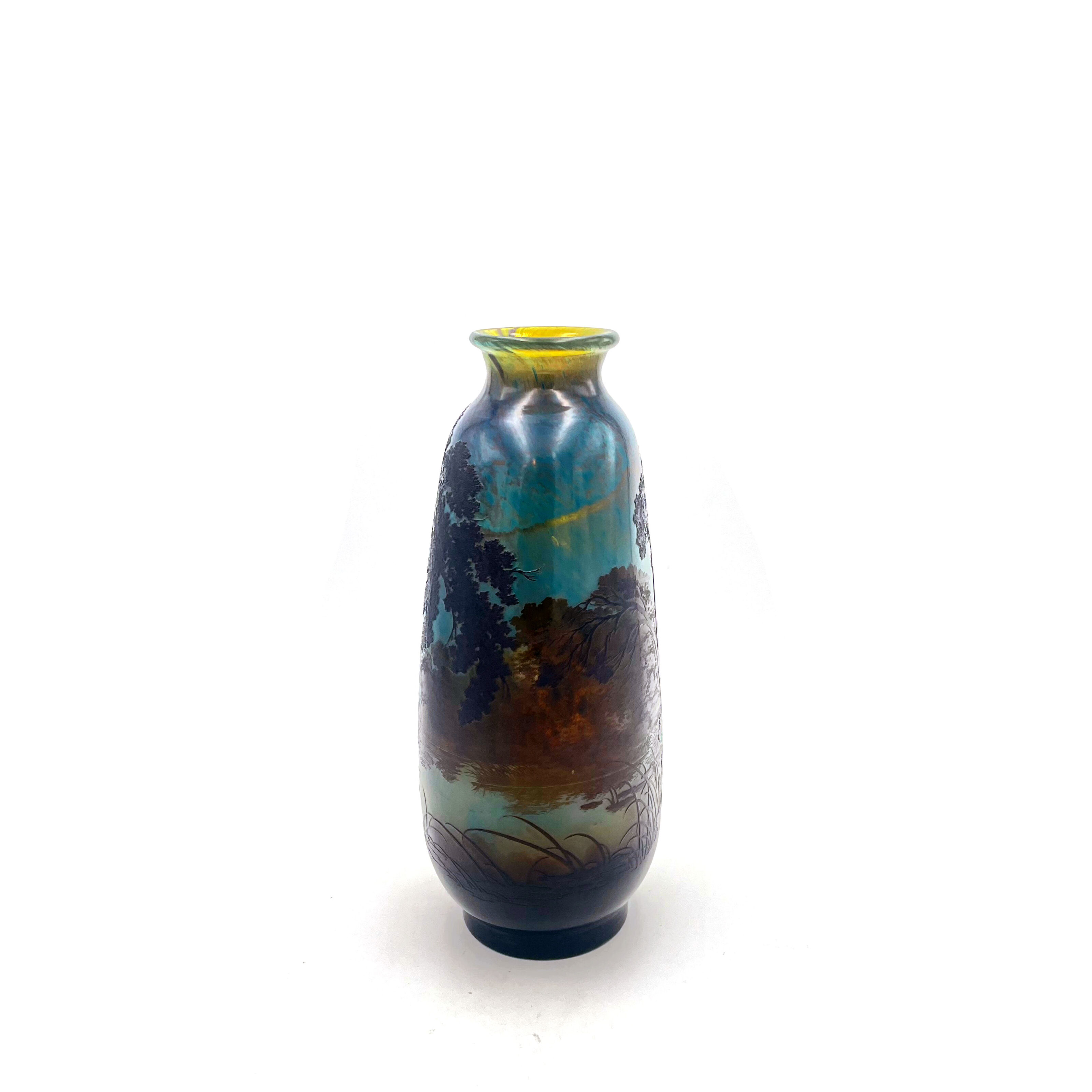 Beautiful Emile Galle Vase, rare internally decorated (intercalaire) scenic, trees and reeds by the water over blue and brown glass with streaks of color within the glass, signed “Galle” on the side. item #5507
