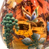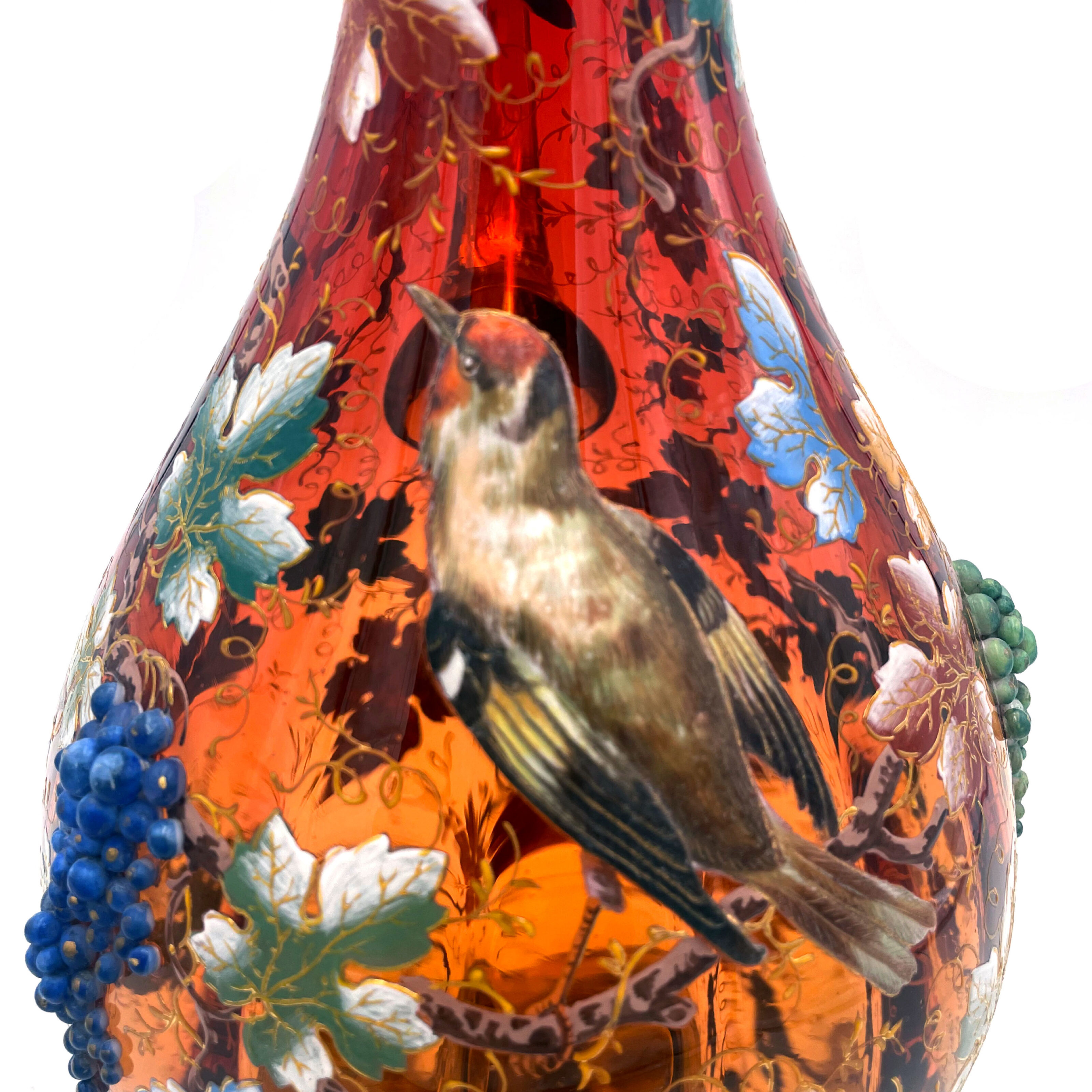 Museum Quality Moser Ewer, cranberry colored glass with an applied bird along with blue and green colored grapes and enameled insects, signed number 2789 on the bottom. Item #2793